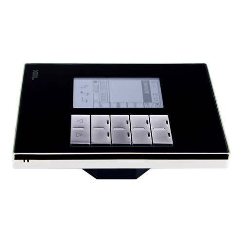 Multi-functional intelligent panel, with eight control buttons, 2 page buttons, each control key with a bit of a matrix LCD display, a control lighting, curtains and so on four general page, page has dedicated air conditioning, geothermal page, with special background music has a special page, four general page inside LCD display content through the programming software can be arbitrary changes.