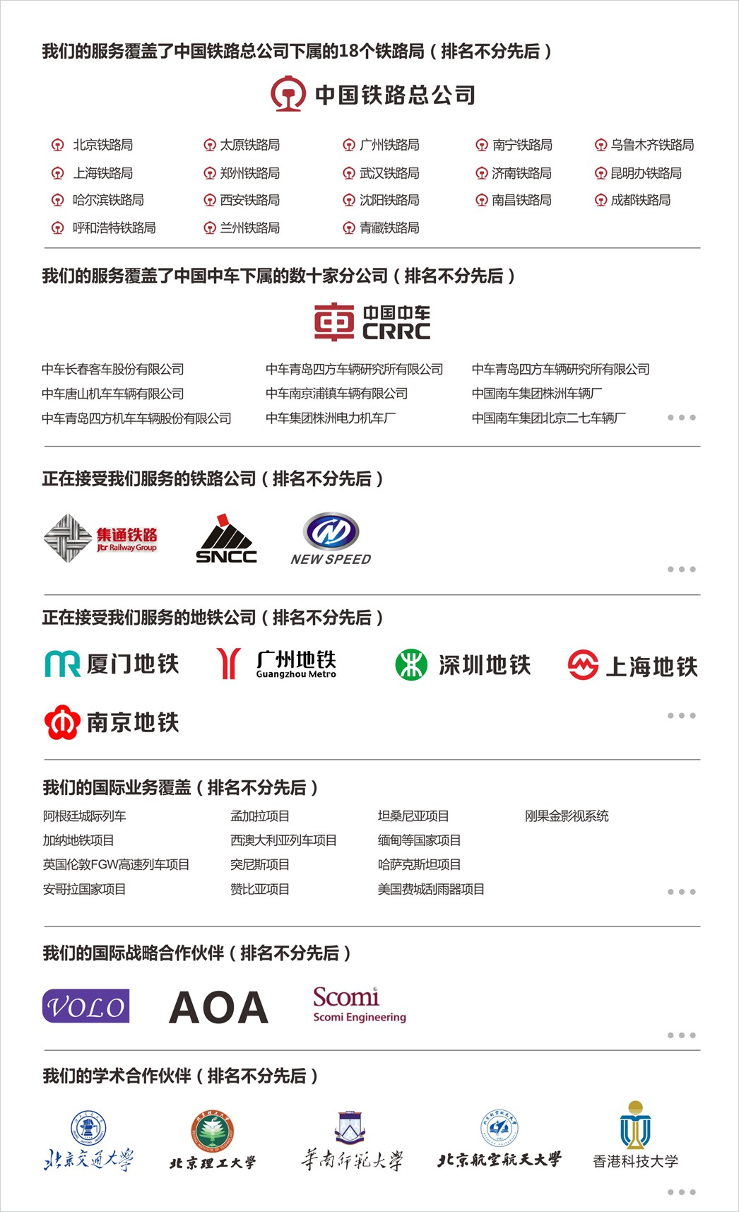 公司与中国铁路总公司及其下属各分支机构,如北京铁路局、太原铁路局、广州铁路局等分局,以及中国南车、中国北车及其下属子公司开展深入广泛的业务合作,为其提供优质的轨道交通配套产品与服务。公司已成为中国铁路总公司、中国南车和中国北车的产品定点采购企业。随着我国铁路的飞速发展和国家实施高铁“走出去”战略,公司产品已远销海外多个国家与地区。