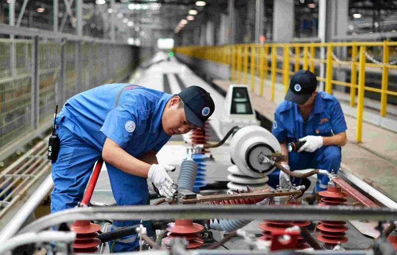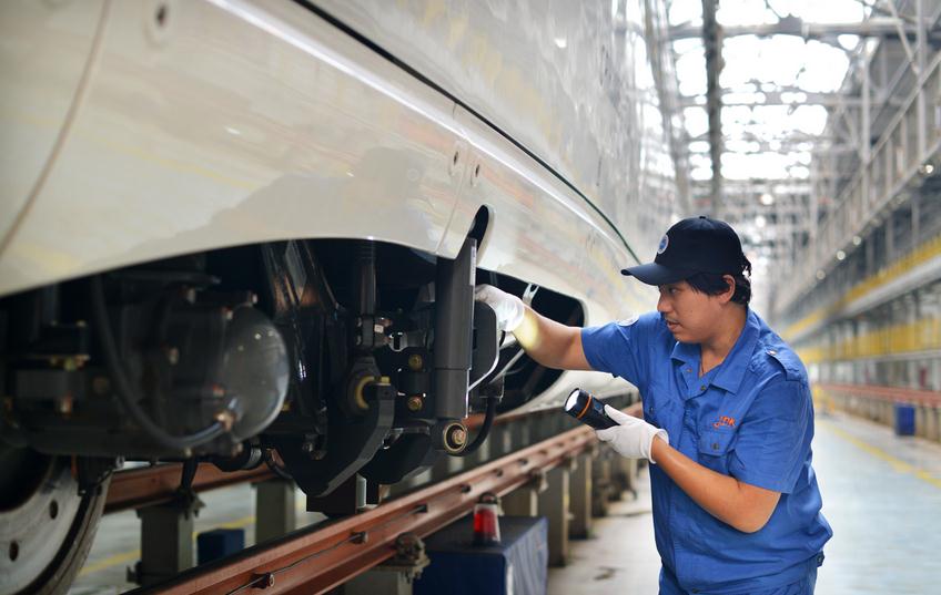 列车驶入检查库后,要首先进行1个小时的无电作业。这时,动车组地勤机械师将对车底和车顶的设备进行检查。其中,由车轮、车轴、制动系统等组成的车底走行部是检查的重中之重。车顶的检查对象包括受电弓、天线和高压电缆等。同时,保洁人员将对列车外皮进行清洗。