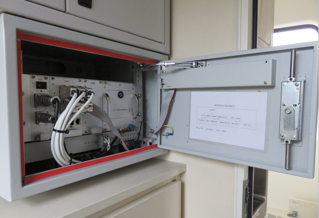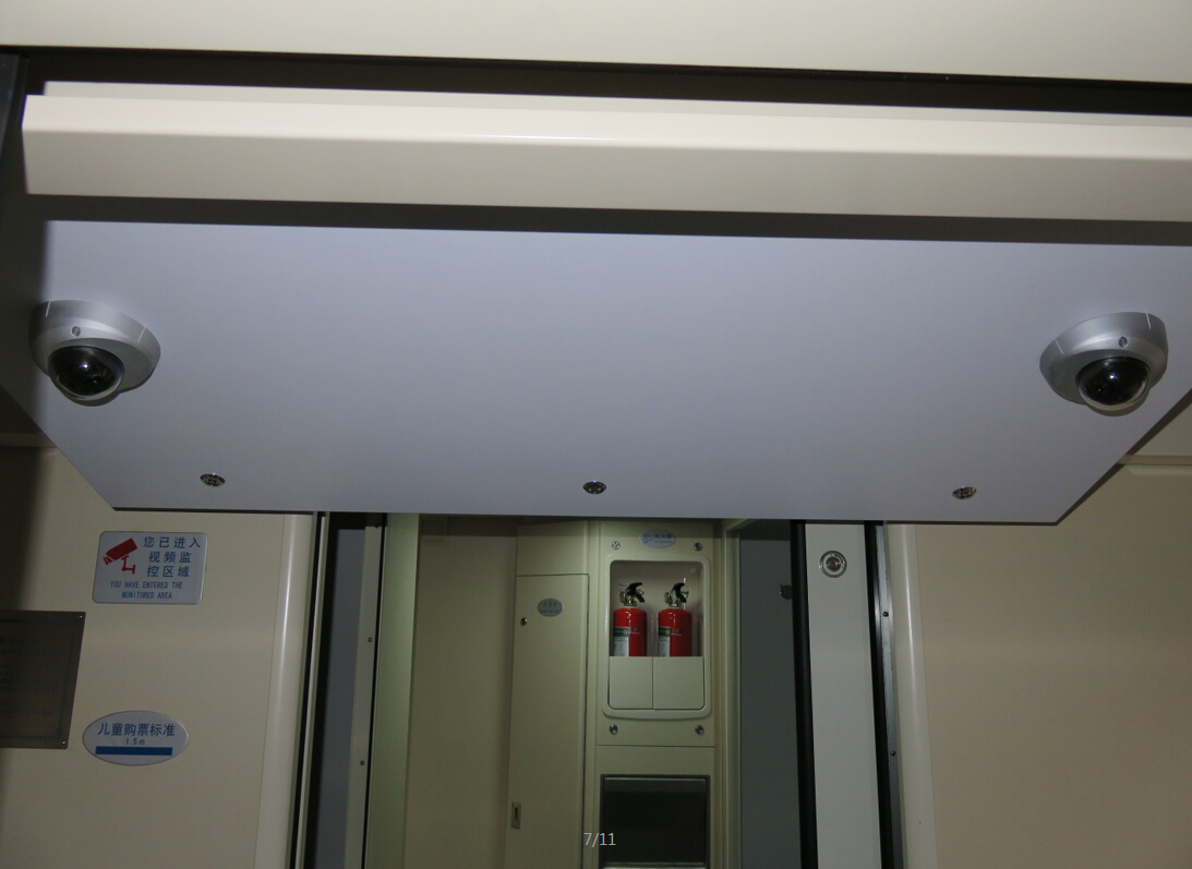 车厢服务器安装在乘务员室。在客室内约1/3和2/3处分别各设一个高清红外摄像机,相对设置;两端通过台靠客室侧放置两个鱼眼摄像机照两侧门;一、二位小走廊靠客室端各设一个广角摄像机朝向客车端部方向。