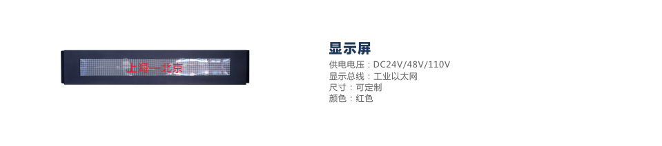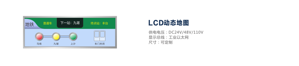 功能:显示屏采用无彩膜双色LED显示,为乘客提供必要的乘车、换乘信息。用于显示列车运行线路、运行方向、下一站、列车当前停靠车站、换乘站以及开门侧等信息,采用无彩膜式双色LED发光管设计,可以显示三种颜色表示不同的信息,每个灯都可以作为一个站。