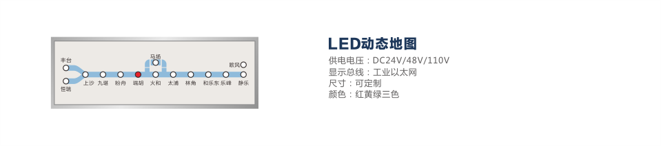 显示方式:红色表示已经经过的站,绿色表示还未到达的站,当列车到站时对应的站名灯为橙色闪烁,离站后下一站的灯为绿色闪烁表示下一站。当设定时间内没有收到通信指令后,自动停止显示,直到收到通信为止,避免误报站,电气接口均位于显示屏侧面,动态地图侧面预留20mm的连接器和走线空间。